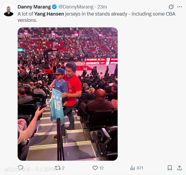 开拓者记者还拍到一位中国球迷抱着自己的儿子手拿杨瀚森CBA青岛球衣来支持小杨。