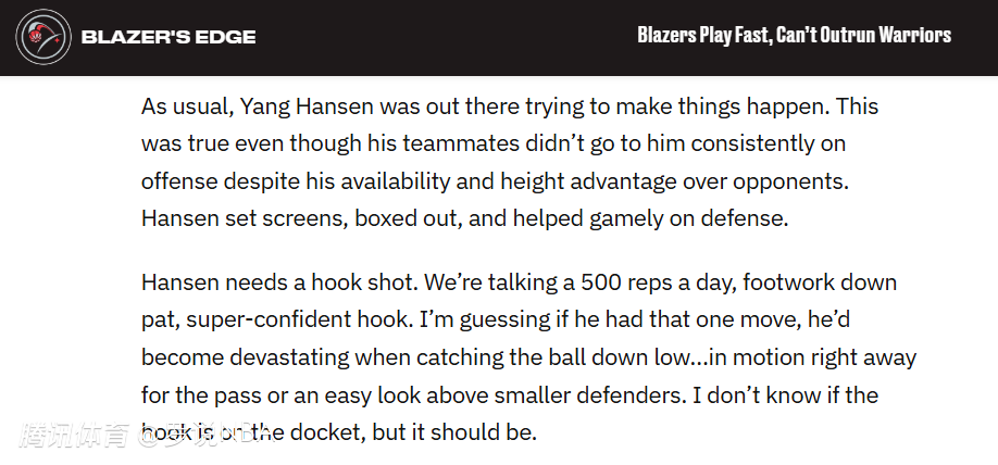 2025-10-15 13:20北京时间10月15日,NBA季前赛,开拓者111-118不敌勇士,杨瀚森出战20分钟,投篮11中4,三分4中1,得到9分6篮板1助攻1盖帽,出现4次犯规和1次失误。赛后,开拓者媒体Blazer'sEdge对主要上场球员进行点评,具体如下——
